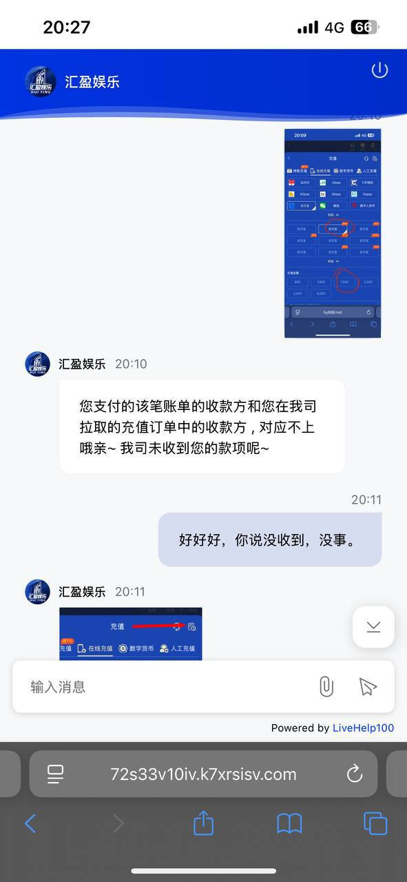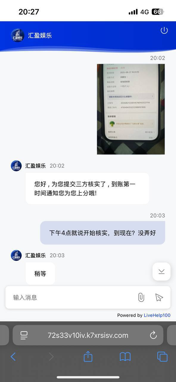 2025年6月21日下午16:24,我通过汇赢平台扫码充值1500元人民币,付款后迟迟未到账。等待十分钟无果后,我立刻联系客服寻求帮助,结果半小时过去仍然没有任何有效处理,只好暂时转去其他平台。